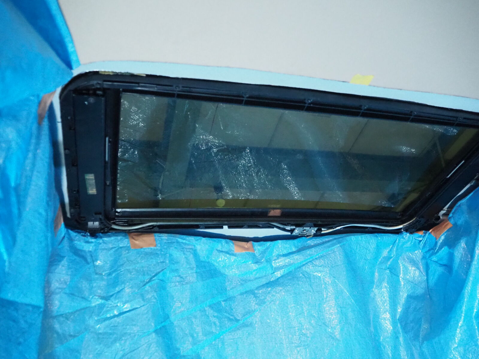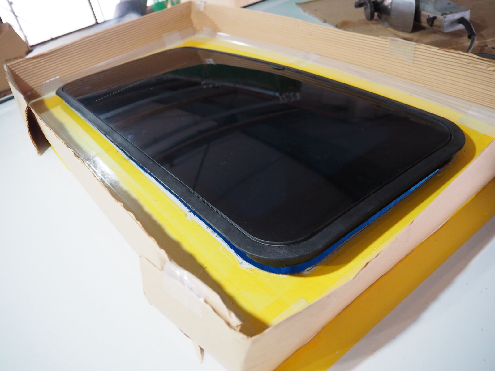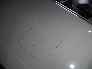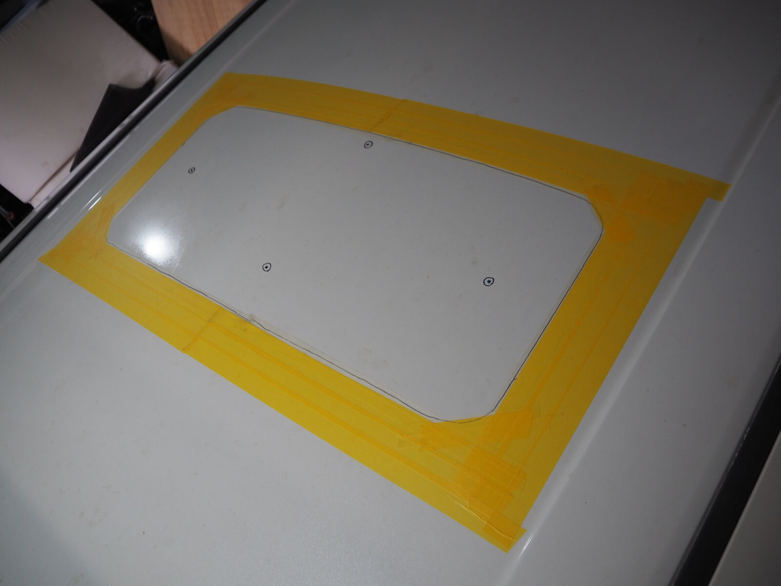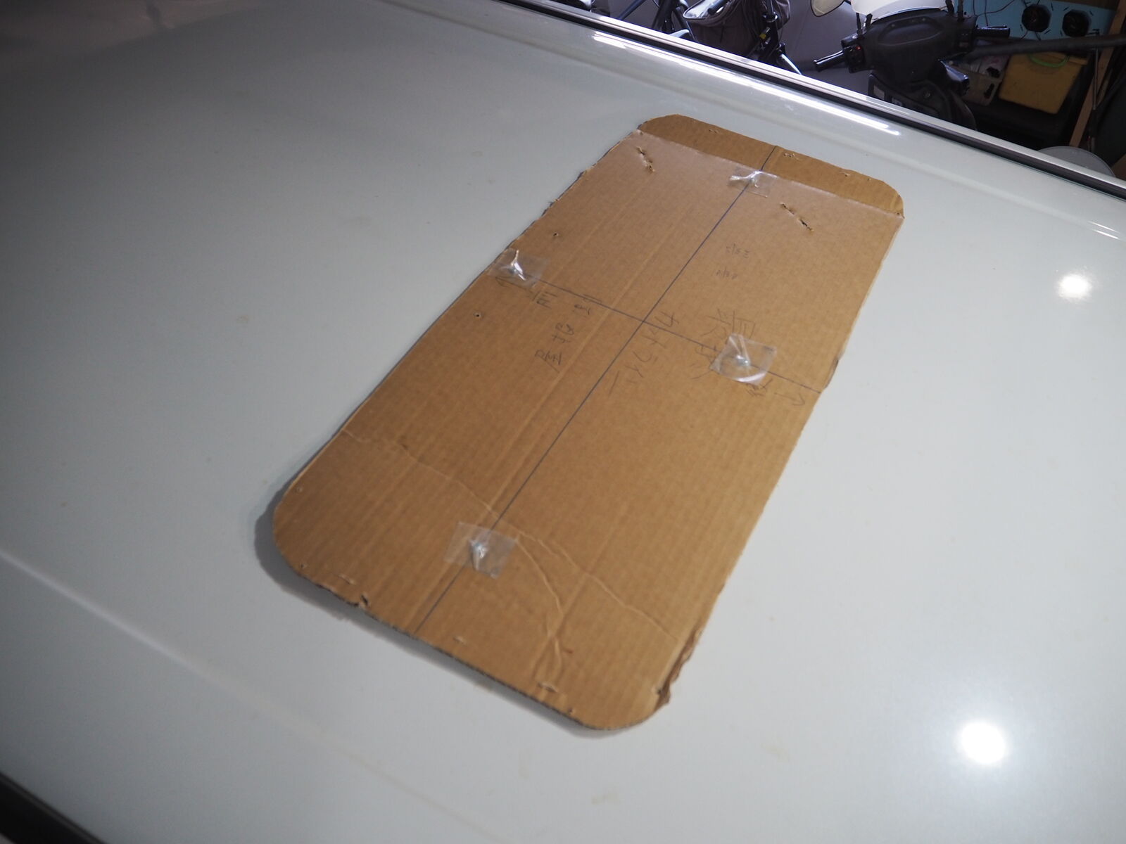 ヴェルファイア サンルーフ取付③ 作業記録 2025.11.04 天井パネルカットに向けてガッツリ養生します 前に付けた基準位置に穴を開けます まだ板金で後戻りできます 基準位置に合わせて天井カット用の型紙を小ネジで固定します マーキング カットに向けてマスキングします カット用に工具を買いました シャーという工具です ヤフオクで3850円+1220円でした シャーを使うための穴を開けていきます 上でドリルを使うときは切り粉が飛ばないようにガムテープの芯でガードします ここまで開けると後戻りはできません ゴミが飛ばないように養生します まずは練習で小さくカット 一気に開けると重みで天井パネルが歪むので、最終カットラインの2cm程内側を切ります 最終カットラインで切ります 開口部にサンルーフを合わせてみましたが当たるところがあって入りません ディスクグラインダーで調整していきます 入りました 養生を剥がすと塗装も盛大に剥がれました カットした部分にはさび止めを塗っておきます
