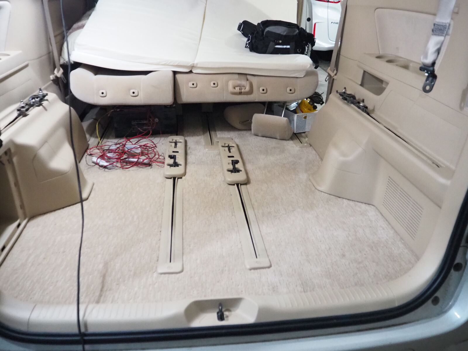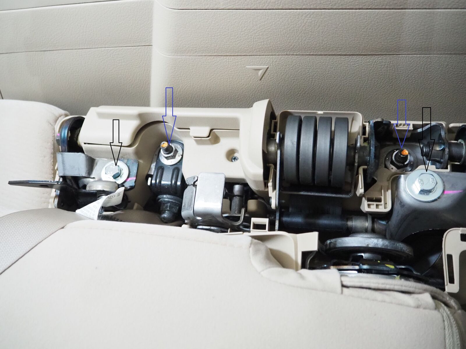 ヴェルファイア サードシート取り外し 作業記録 2025.09.19 サードシートを外してみました まずはシートを倒すレバーのカバーを外します 引っ張れば外れます カバーも引っ張れば外れます このカバーを外して 黒いカバーも外します 黒矢印の位置にボルトを入れます 前側はM8×50mm 後ろ側はM8×70mmです(きっちり同じ長さでなくても大丈夫です) ボルトを付けたら青矢印のナットを2個外します シートが外れました
