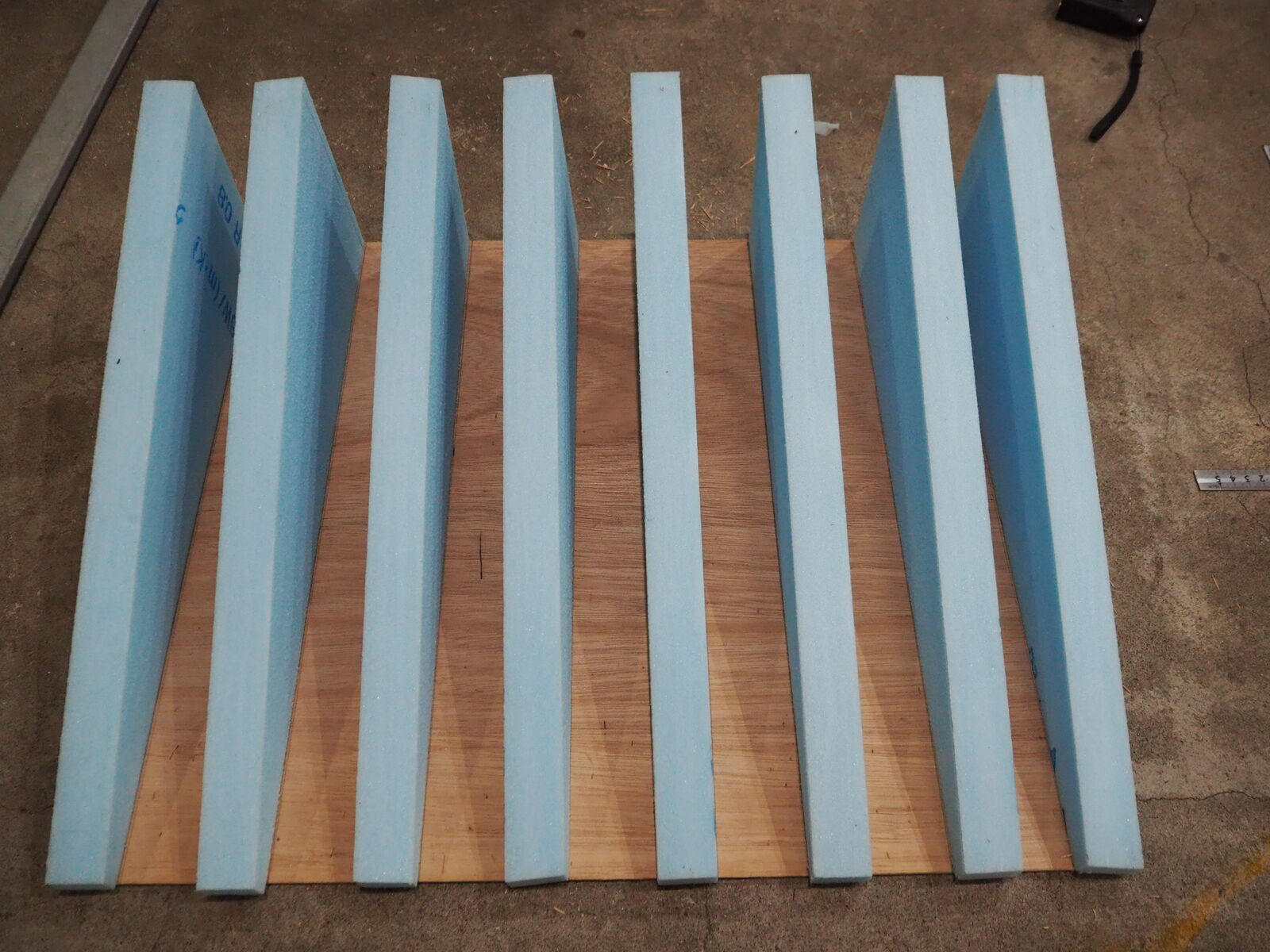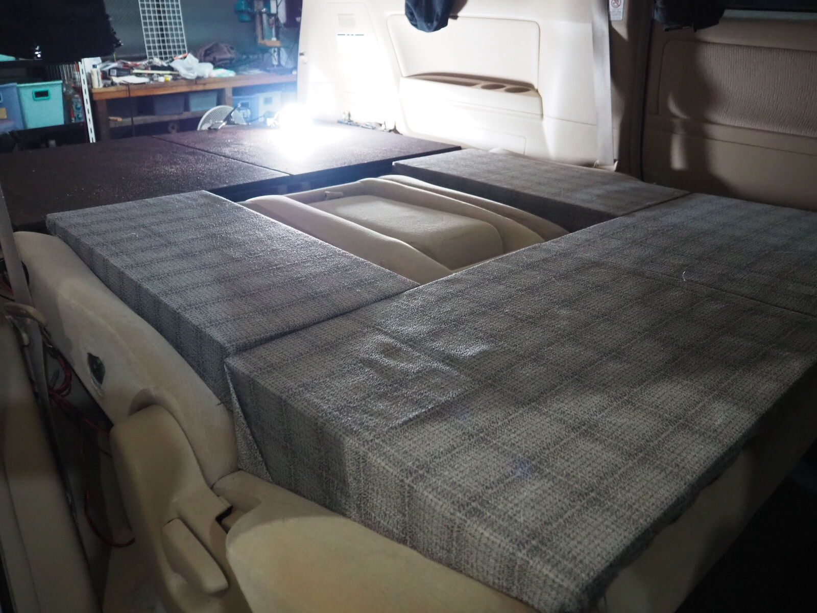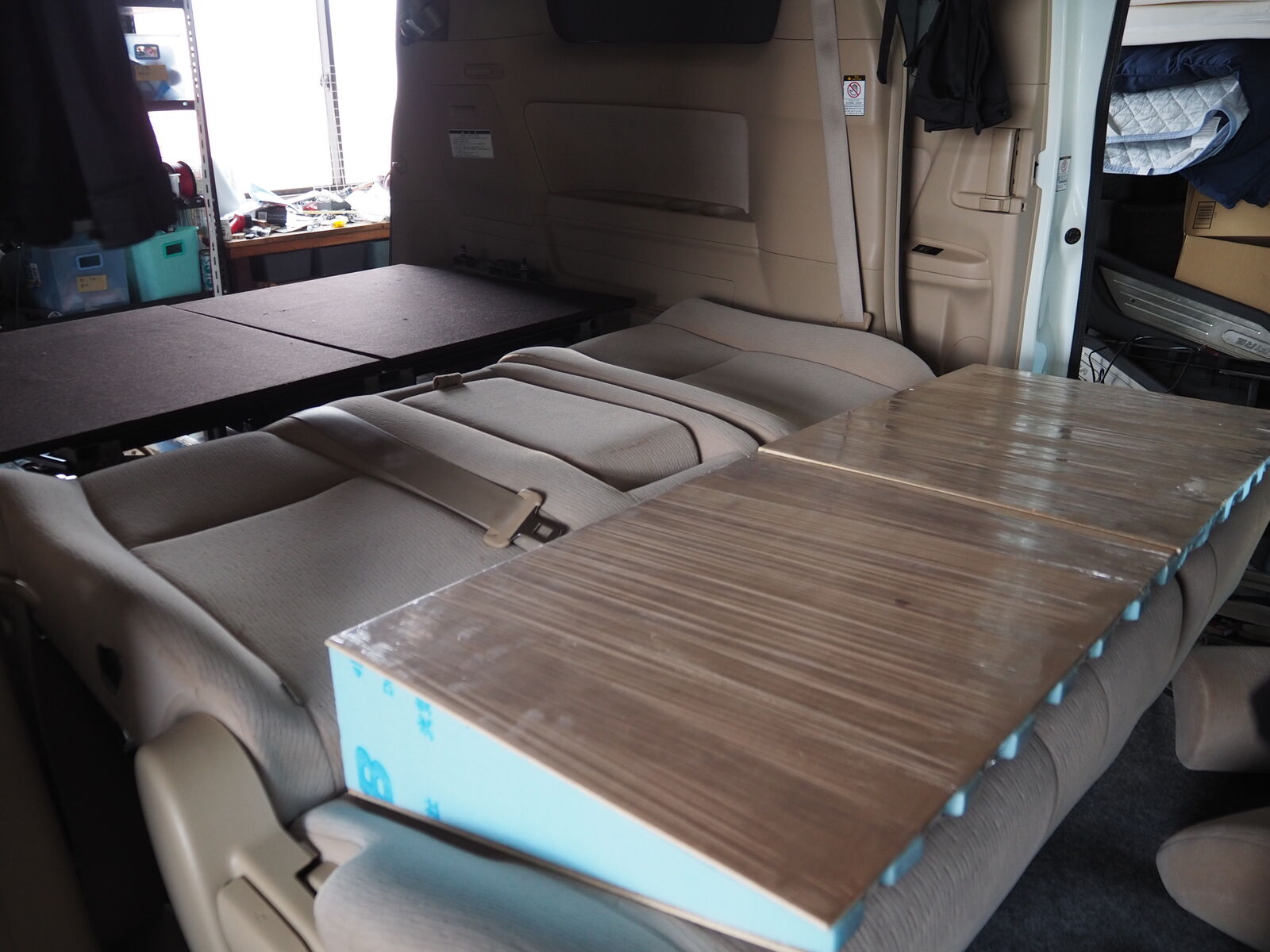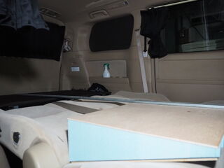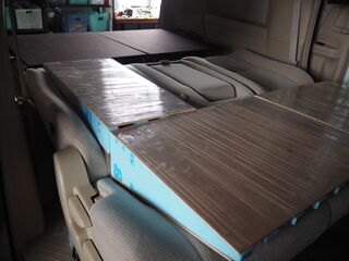 ヴェルファイア デコボコ補正 作業記録 2025.09.25 二列目のデコボコが気になるので補正をしてみようかと スタイロフォームを三角に切ります 薄いベニアに両面テープで貼り付けていきます ベニアでサンド だいたい水平 ラップで固定して 背もたれ部分も作ります 見栄え的に布を巻いてできあがり ちょっと窪みの気になるところはありますが、当分はこれでいけそう