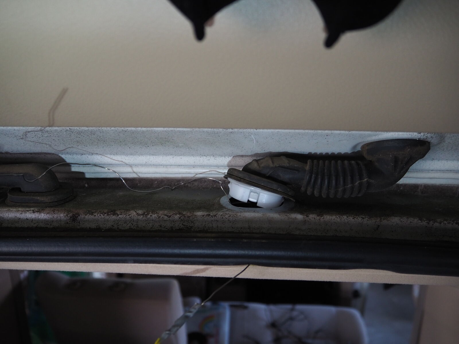 ヴェルファイア ドラレコ取付 作業記録 2025.10.06 前の車で使っていたデジタルミラー兼ドラレコを取り付けます 一番の難所はやはりここ 車体本体からバックドアへの貫通部分 両側からガイド線を引き 蛇腹内を通したかったですができなかったので外側を 付きました